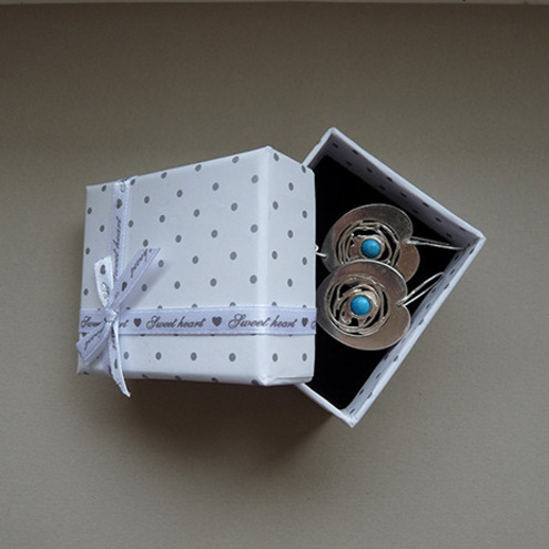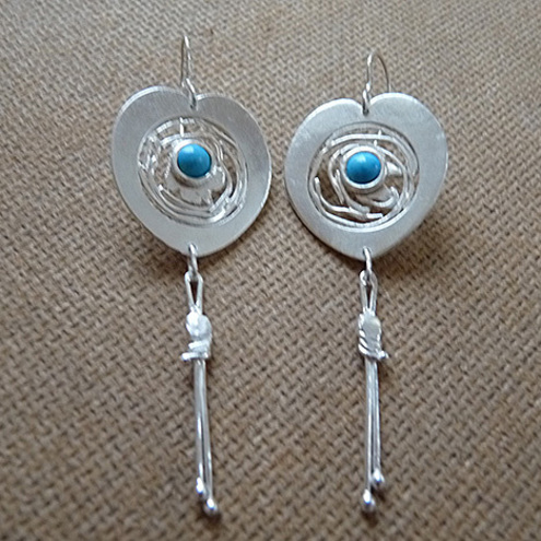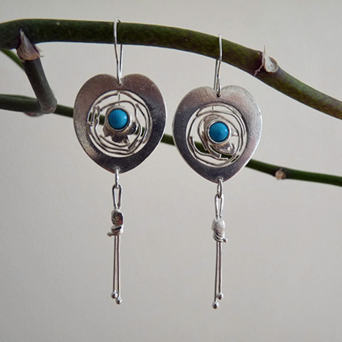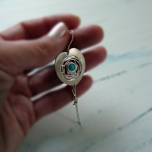 Lovely, handmade sterling silver heart earrings with Turquoise. The heart has been cut out by hand. " The inside" of the heart is handcrafted piece by piece out of sterling silver wire. The earrings hang from handmade sterling silver ear hooks. They have been polished to a shiny and bright finish.