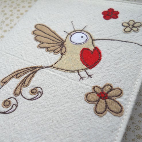 the hummingbird is in neutral cream and beige cottons, with a red heart on its chest, which is appliqued onto pre-washed calico, before being "drawn" on with free machine embroidery.