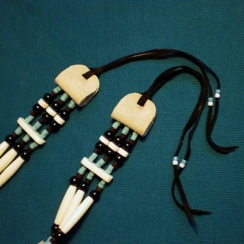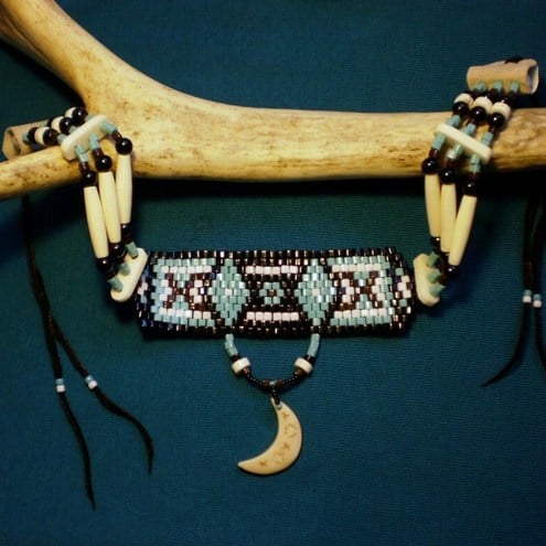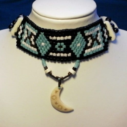 This lovely choker was inspired by Native American beadwork. I have used 3mm toho cube beads to do the peyote beadwork and I have attached three rows of hairpipe beads to either side. The choker measures 13 1/2" and has a 5 1/2" suede tie. The moon is carved from bone and measures 1 1/4". The choker can be worn either way so you can have the moon waxing or waning.