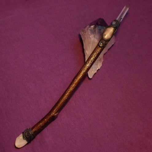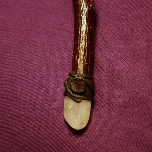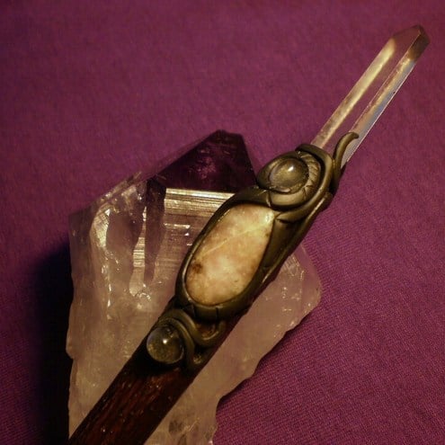 A lovely little wand made to aid divination and meditation. I have made this 10" wand from hazel. Hazel brings wisdom and knowledge, It increases intuition and is very inspiring. On the top I have attached a 1 1/4" quartz point. Quartz is used for scrying, it stimulates psychism and amplifies power. Underneath is lepidolte. Known as the peace stone. It calms the mind and increases psychic awareness. There are also two rainbow moonstones and a piece of amethyst. Both these crystal are calming, meditative and increase psychic awareness. A beautiful addition to your magical collection.