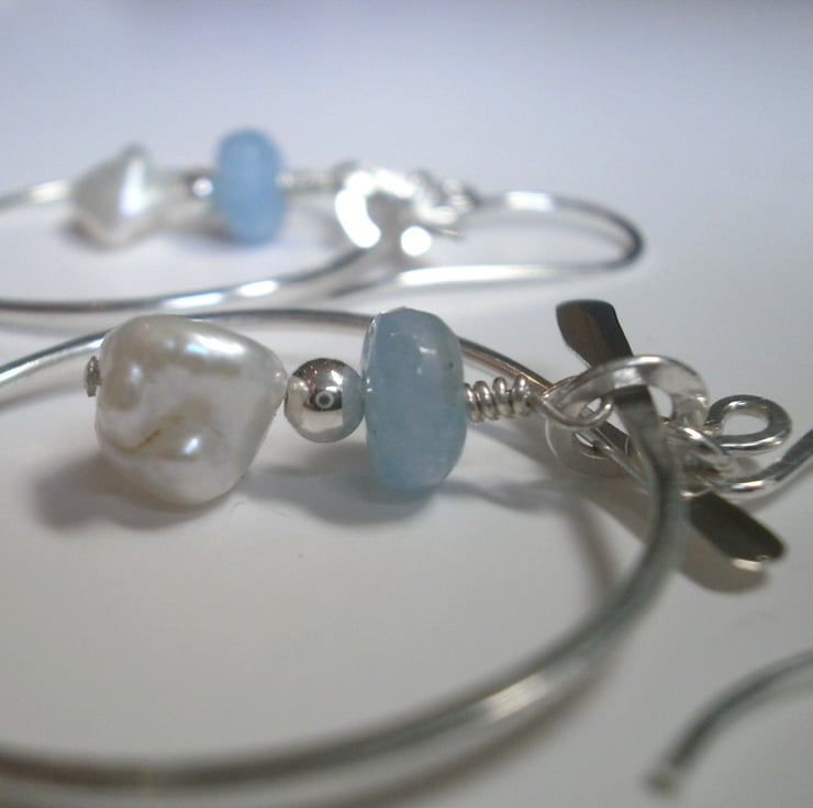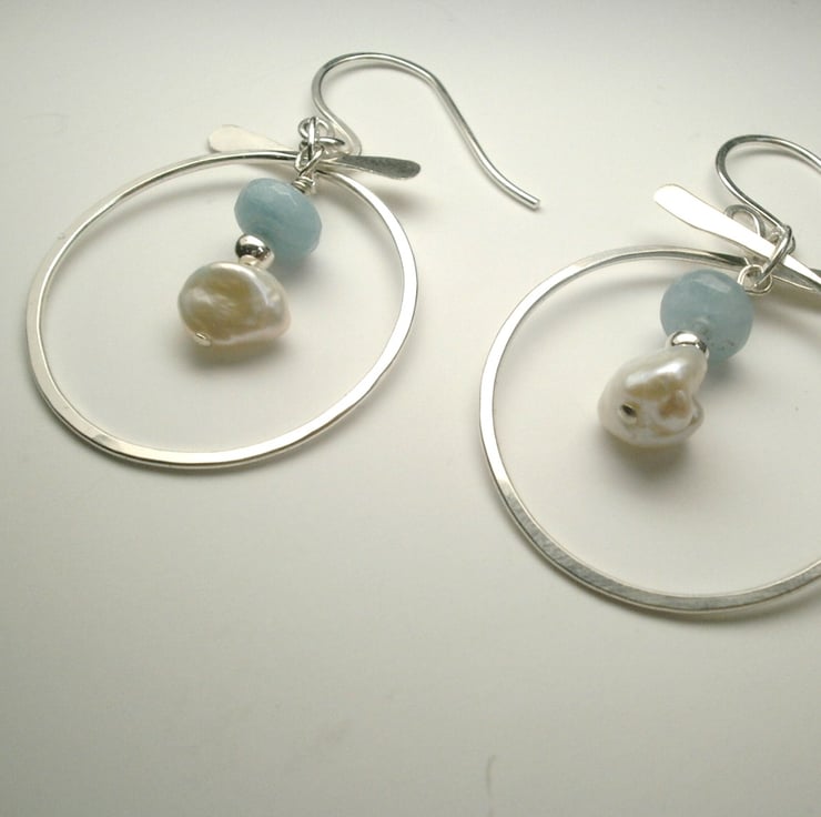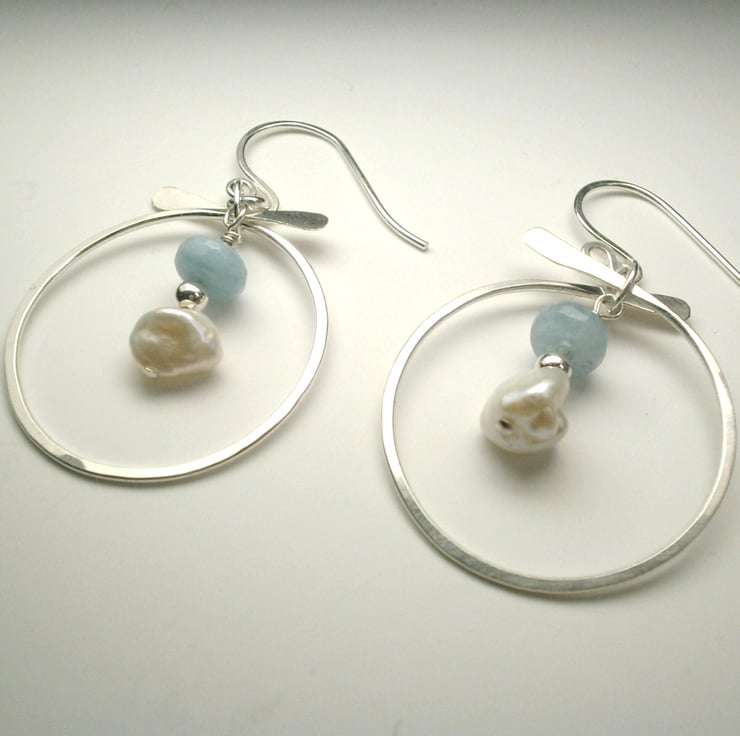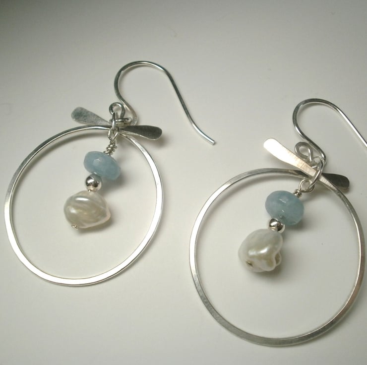 I created these earrings with forged sterling silver wire and fastened the bows with a small hammered sterling silver jump ring. The keishi pearl and aquamarine rondelle are suspended under the bow, adding a gentle soft colour.