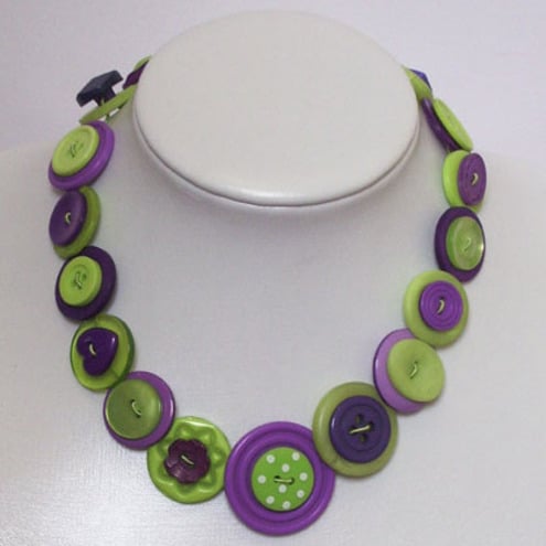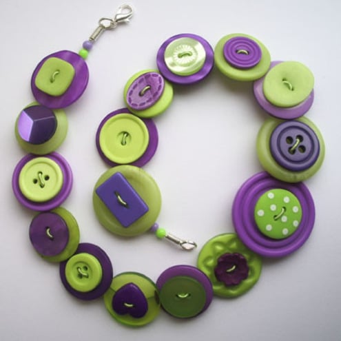 This distinctive button necklace is rich with an assortment of purple and lime green buttons. These are threaded onto jewellery wire, which secures at the end with a silver plated lobster clasp fastener.
