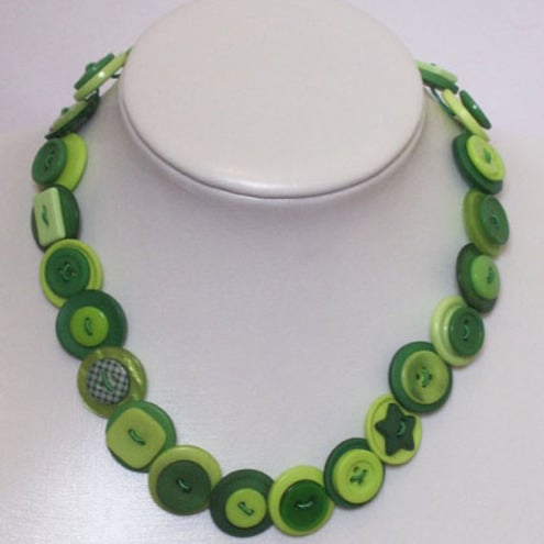 This distinctive button necklace is rich with an assortment of dark and lime green buttons. These are threaded onto jewellery wire, which secures at the end with a silver plated lobster clasp fastener.