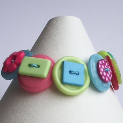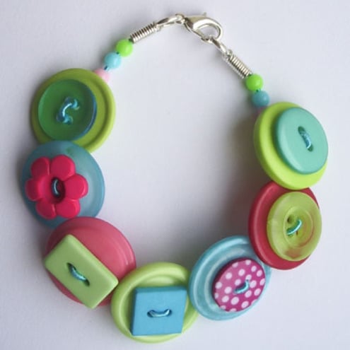 This distinctive button bracelet is rich with an assortment of lime green, pink, turquoise and aqua buttons. These are threaded onto jewellery wire, which secures at the end with a silver plated lobster clasp fastener.
