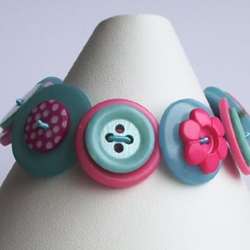 This distinctive button bracelet is rich with an assortment of pink, turquoise and aqua buttons. These are threaded onto jewellery wire, which secures at the end with a silver plated lobster clasp fastener.