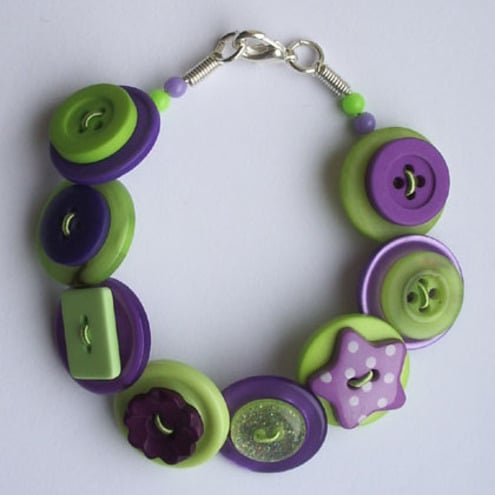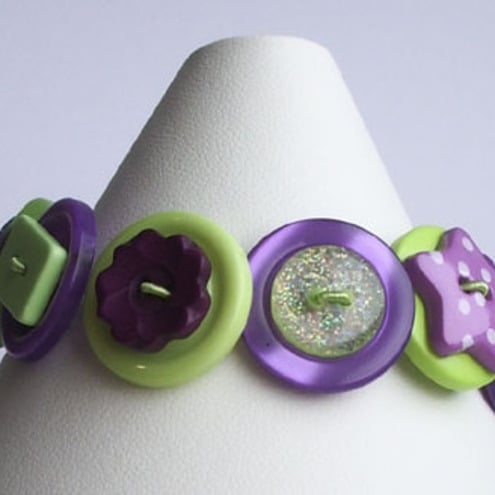 This distinctive button bracelet is rich with an assortment of purple and lime green buttons. These are threaded onto jewellery wire, which secures at the end with a silver plated lobster clasp fastener.
