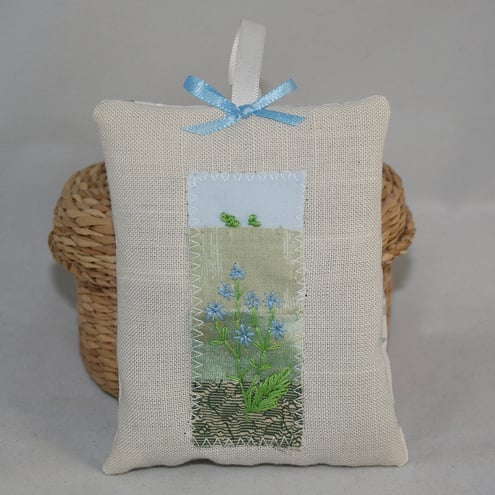The landscape background to each embroidery has been created from the applique of four different fabrics. Simple embroidery stitches have then been used to depict three different flowers - white hog weed; the bright pink of red campion; pale blue of chicory.