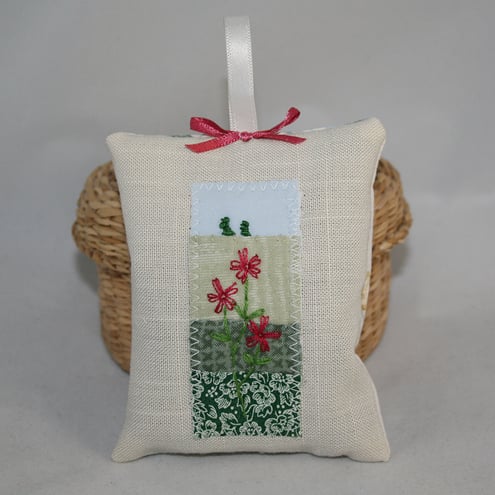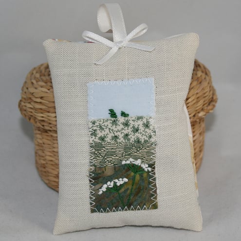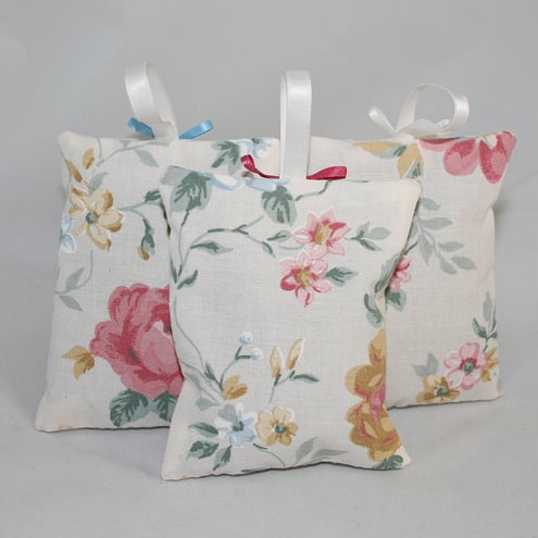 The front of each sachet is a cream linen-effect fabric. The back of each sachet is a floral print in pastel shades. A ribbon hanging loop is stitched into the top seem and a ribbon bow is added for further decoration.