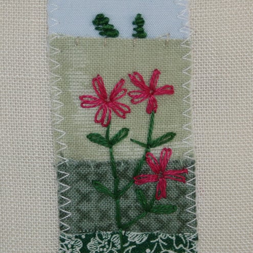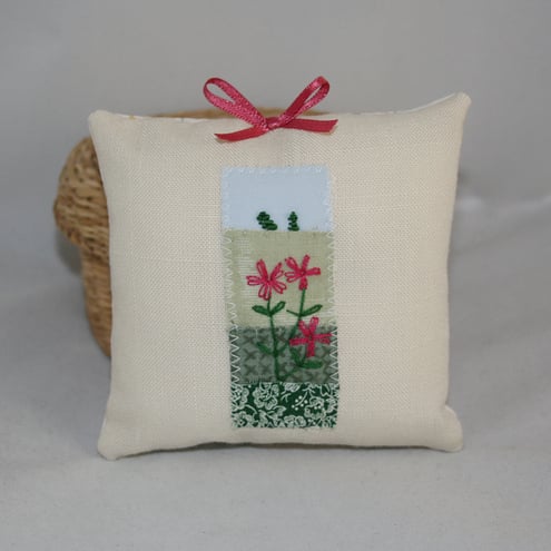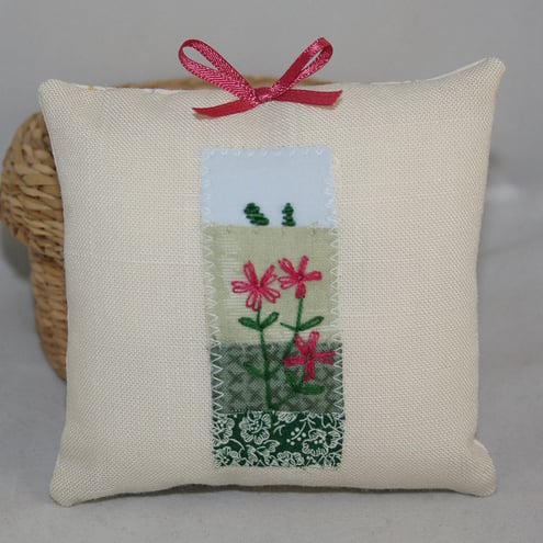 An appliqueed and embroidered panel, of depicting red campion, has been slip-stitched to the top of this pretty pin cushion.