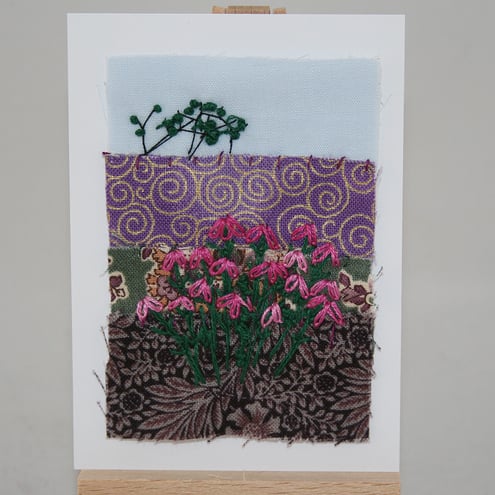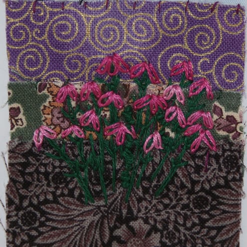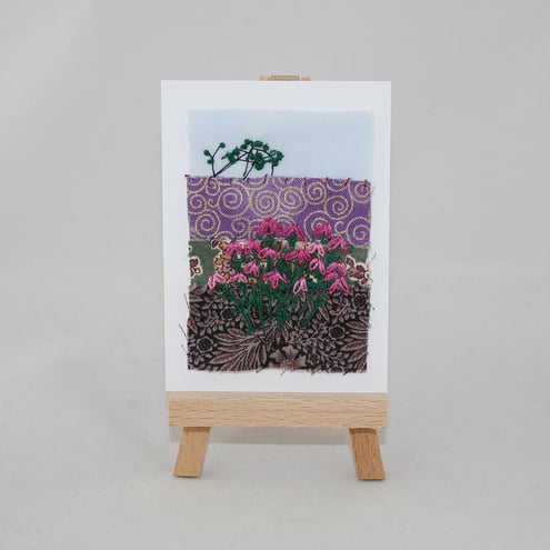 An applique panel forms the backdrop for this design. Flowers, stitched in embroidery threads, give colour and texture. The embroidered panel is then tacked to the ACEO background, formed of a white board.