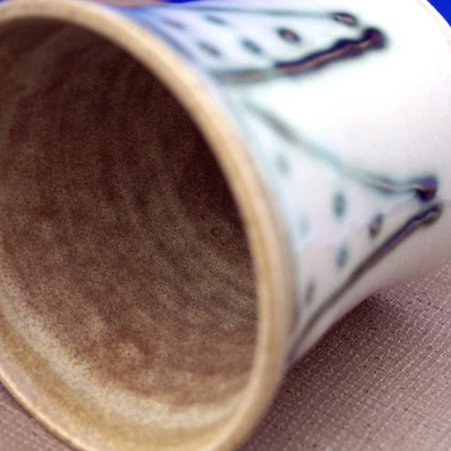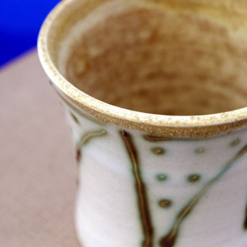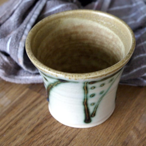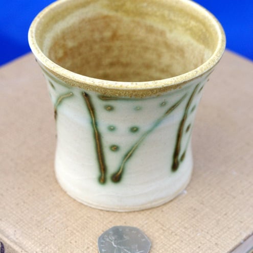 A slip trailed geometric pattern in green decorates the outside to accentuate the soft curves of this piece. It is inspired by cornish Troika pottery which has a particularly ethnic look.