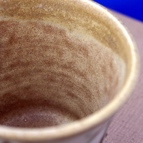 This small fluted vase is glazed outside in transparent bringing out the natural tan colour of the clay. Inside is glazed in oatmeal in shades of brown.
