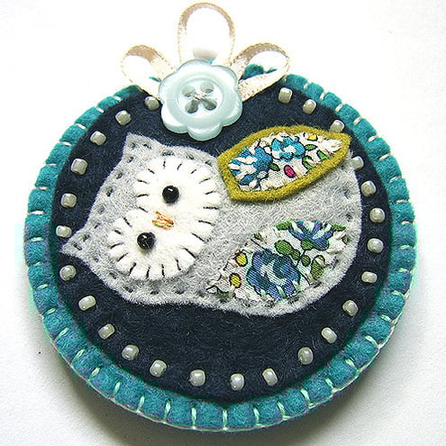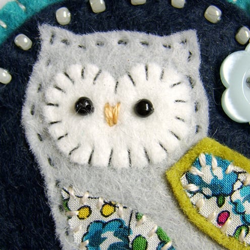 It features a little owl with appliqued wing and belly in pretty Liberty print fabric. It is mounted onto a deep blue circular felt base which is edged with pretty cream seed beads. It is further mounted onto a turquoise backing and is finished with a button and ribbon detail. It has a brooch backing for easy attachment.