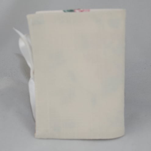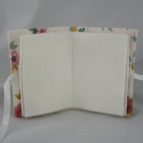 The cover of this needle book has been stitched from cream, linen effect fabric, backed with heavy iron-on interfacing, and lined with a cotton fabric in a floral print. The 'pages' of the needle book are formed of two pieces of felt - giving a total of four 'pages'. The needle book closes with a ribbon bow.