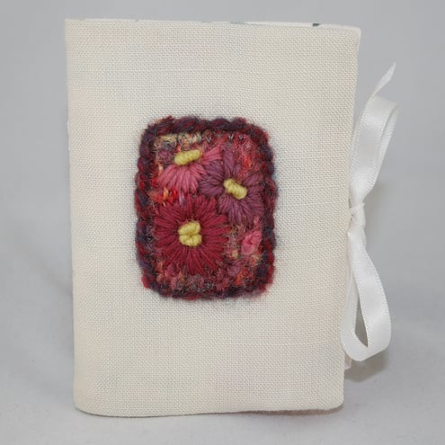 A decorative panel of pink daisies, hand stitched in tapestry wools on a knitted and felted background, has been slip-stitched to the cover of this pretty needle book and framed with couching over a toning yarn.