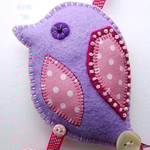 This is a pretty hanging decoration featuring a felt bird with appliqued wing and belly in pink polka dot fabric. It is finished with beading details and a pretty gingham ribbon and button tail.