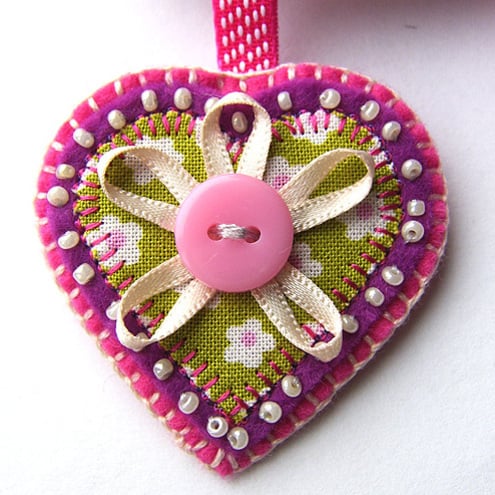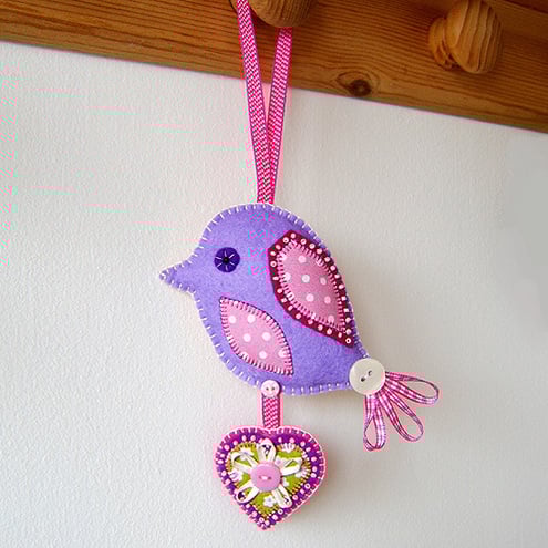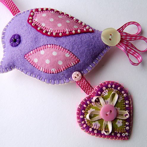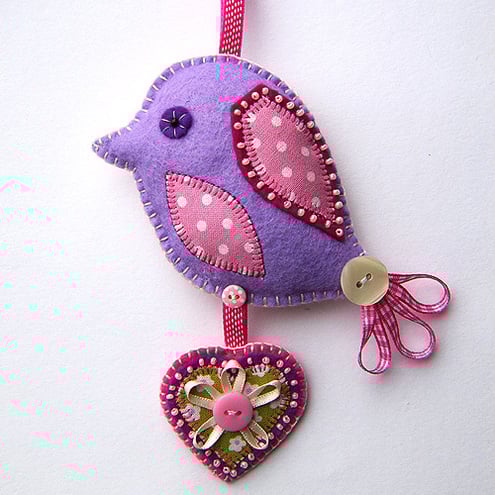 The decoration is complete with an appliqued heart in coordinating fabrics, also with beading and ribbon details. This hangs below the bird.