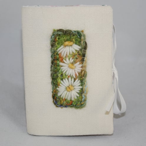 A panel, of daisies hand embroidered in tapestry wools on a hand-knitted and felted background, has been slip-stitched to the cover of this hand-made notepad. The panel is framed in couching over a toning yarn.