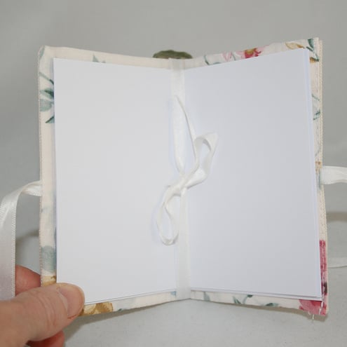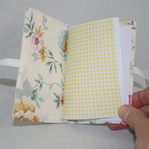 The 'pages' of the notepad are of a standard A6 size folded in half. They are held in place by a ribbon tied around the spine of the notepad. The notepad may either be used as a source of loose notes or you may jot in it as a notebook, or a mixture of the two. The notepad is supplied with 16 folded A6 sheets - giving 32 pages, 64 'sides'. These standard size pages may be replenished by simply re-tying the ribbon around a new supply. The 'end-papers' are a pretty yellow checked paper. The notepad closes with a ribbon bow.