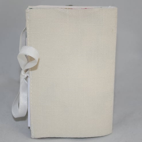 The cover of this notepad has been stitched from cream, linen effect fabric, backed with heavy iron-on interfacing, and lined with a cotton fabric in a floral print. The cover has been further reinforced by a layer of plastic cut from a re-cycled bottle.
