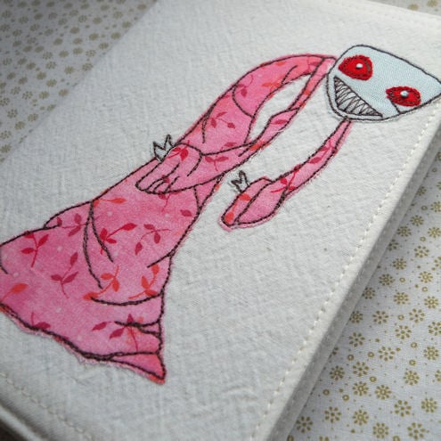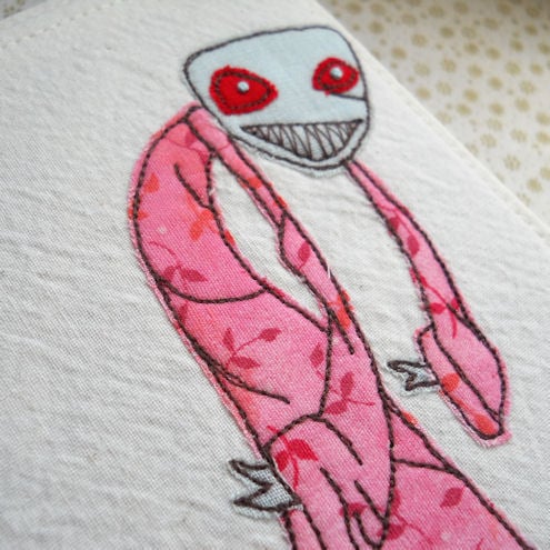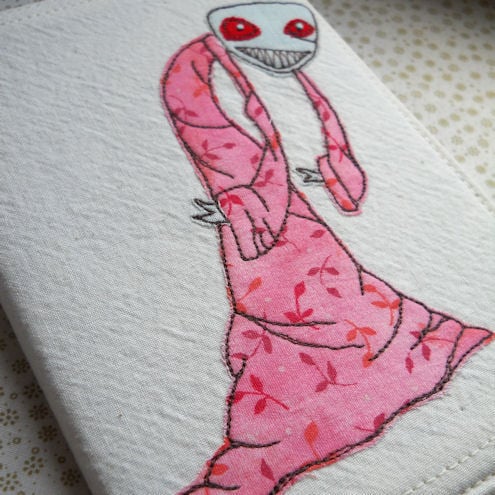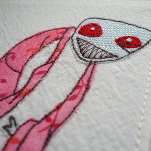 this menacing, shuffling zombie is in pink printed-floral cotton fabric, which is appliqued onto pre-washed calico, before being "drawn" on with free machine embroidery. it features hand embroidered eyeballs and wicked sharp teeth!