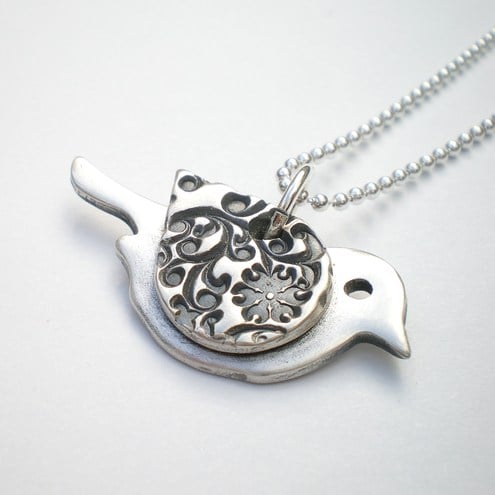 Cute silver bird pendant with an orange blossom texture wing. Inspired by nature and made from recycled silver he makes a great eco friendly choice!