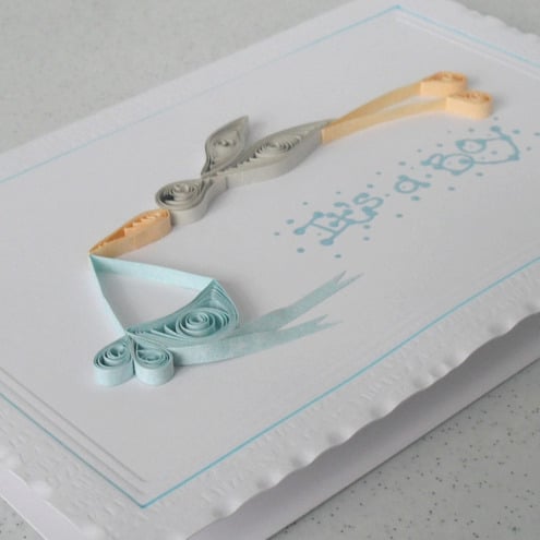 The greeting on this card reads “It's a boy" embossed in pale blue.
