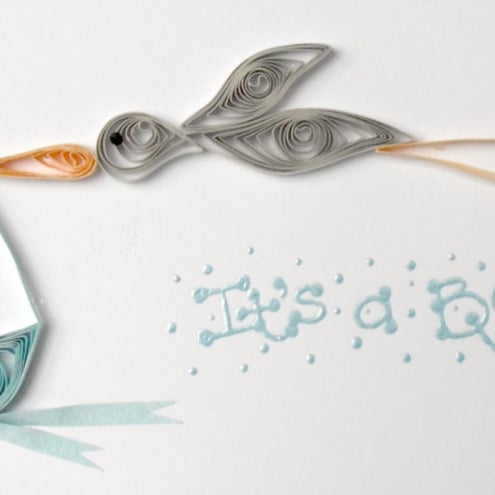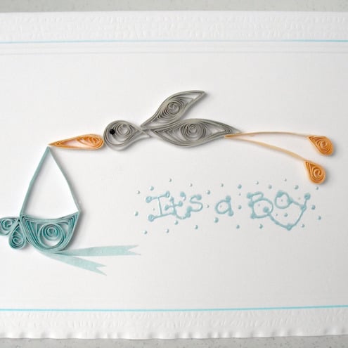 Measuring 6" x 4" approx, this card has a white embossed border and features a quilled stork carrying a very precious bundle - ideal to send congratulations on the birth of a new baby boy.
