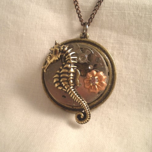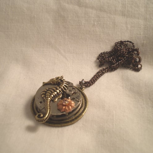 This unique dainty Steampunk necklace was created from vintage elements, a watch movement was mounted onto a brass filigree base, which has become the home of a delightful antiqued gold tone seahorse.