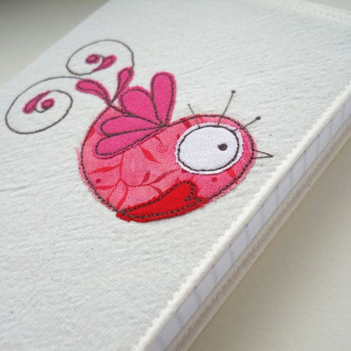 the bird is in pink printed cotton, with bright pink wings and tail feathers and a red heart on her chest. the cotton fabrics are layered & appliqued onto pre-washed calico, before being "drawn" on with free machine embroidery.