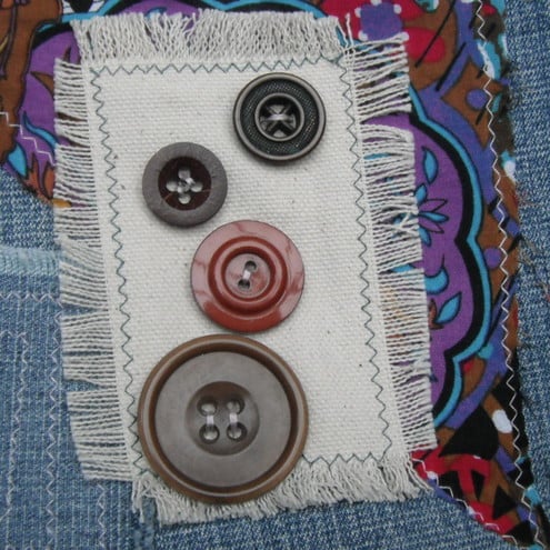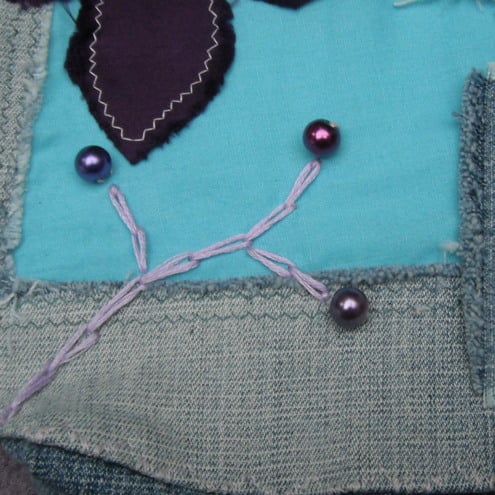 This is a blue stone-wash denim bag. This has been covered with a printed fabric patch, a calico patch, an open blue cotton patch and an appliquéd flower design. Hand finished with Czech glass pearls, and stunning vintage buttons. Fully lined with calico, and with a contrasting inside pocket to stash your phone and lippy!