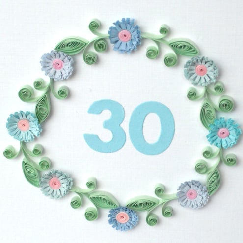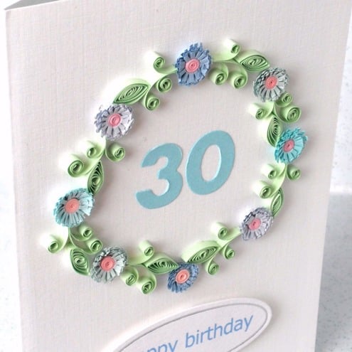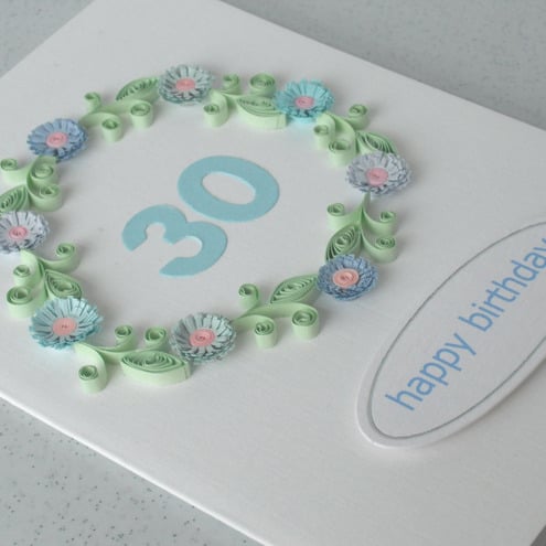 A beautiful handmade quilled greeting card with quilling flowers in coordinating shades of blue and pink. Perfect for sending birthday wishes to someone special.
