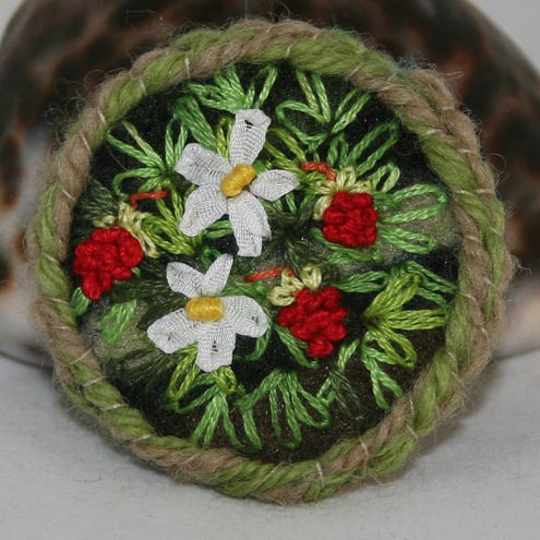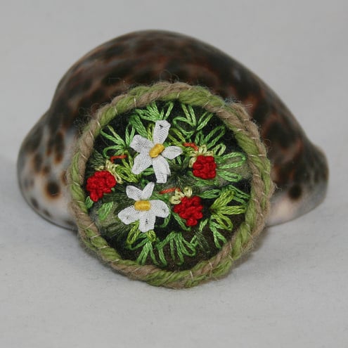 A little clump of sweet, wild strawberries are hand-embroidered onto this brooch.