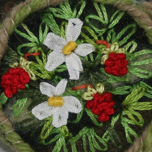 The background is a soft green fabric, which has been heavily embellished with several layers of embroidered leaves to give depth to the design. The strawberry flowers are embroidered in silk ribbon, and embroidery threads. The tiny strawberries are clusters of French knots.