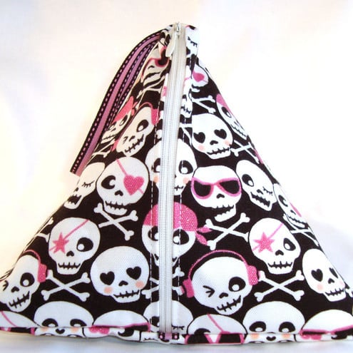 Sewn in beautiful designer fabric, these gorgeous Pyramid Project Bags measure 7" high x 7" wide. The cases are fully lined with a zip fastening closing and carry handle made from ribbon. They are able to hold a sock knitting project with Dpns and 100g of yarn or a small crochet project, yarn and hook.