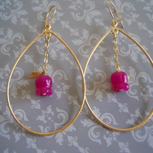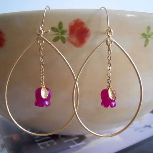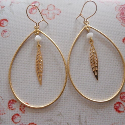 These matte gold earrings are very classy. They have a long skinny leaf hanging in the middle with a little duck egg blue bead at the top. They hang on small kidney ear wires. If you would prefer a different colour bead just let me know. Or, if you would like the pink tulip, just let me know when ordering.