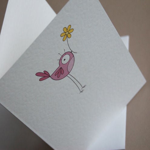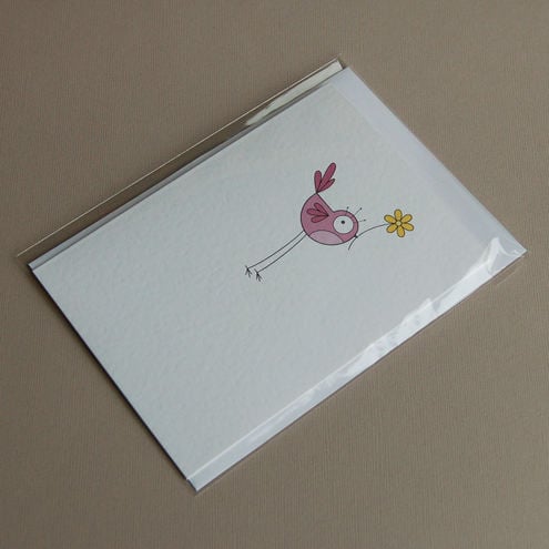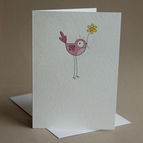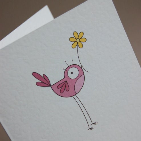 unique and quirky illustrated card featuring a little dusky pink bird, holding a bright yellow flower, just for you!