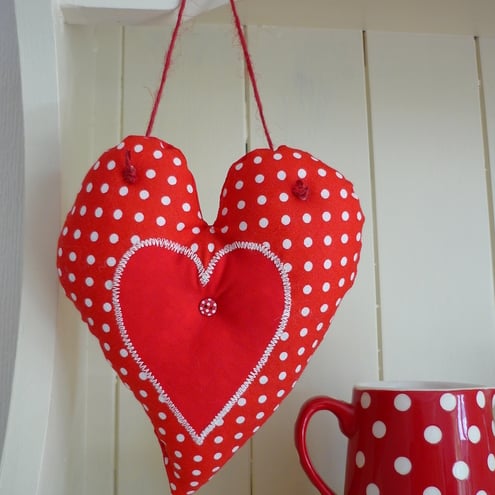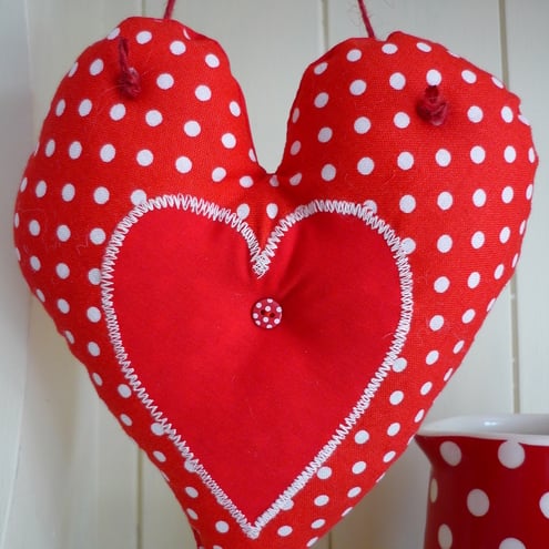 I have made it from quality Tanya Whelan fabric, from the Delilah range ~ Red with white spots. It has an appliqué heart in red and a red button detail. It hangs from red twine.