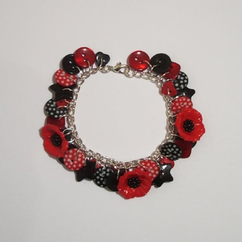 This distinctive button bracelet rich with an assortment of red and black buttons, features three red poppy buttons.