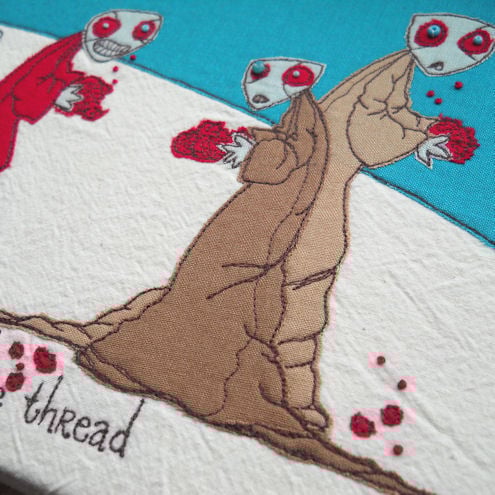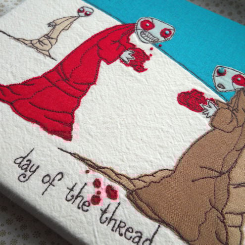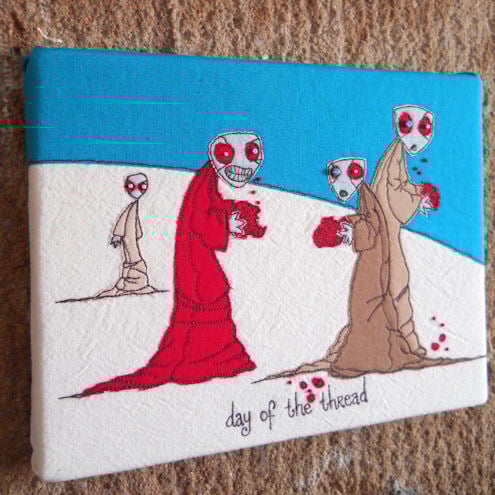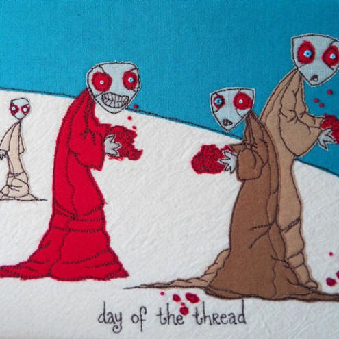 these zombies are shuffling along in their cotton outfits, which are appliqued onto calico, before being "drawn" on with free machine embroidery. they have googly eyes made out of tiny pale blue beads, and hand embroidered blood and brain matter spills to the floor.