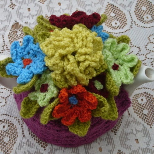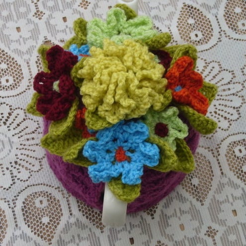 The cosy has been handmade using good quality yarn in a lovely plum colour. The top of the cosy is decorated with a large crochet carnation in mustard with four green leaves. Around the edges of the carnation are four individual flowers in light green, blue, orange and maroon all with green leaves. In between these flowers are very pretty little flowers in contrasting colours with crochet bobble centres.