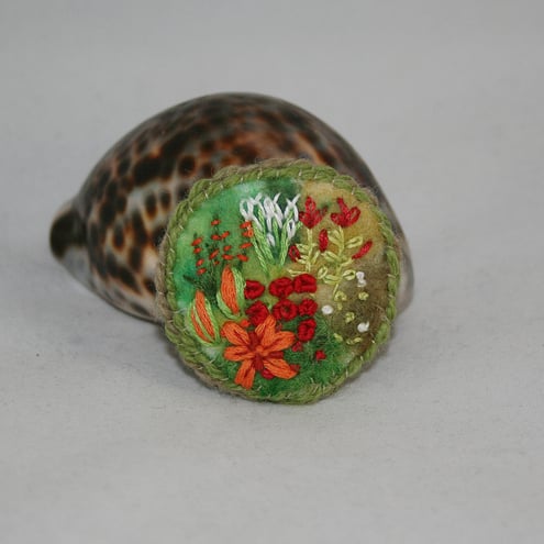 The background of this brooch has been needle felted using hand-dyed fibres, including merino and silk. The lily and buds in the foreground are stitched in a mixture of knitting ribbon and embroidery threads. The roses, lillies, irises etc in the border are stitched in embroidery threads using a combination of simple sticthes.