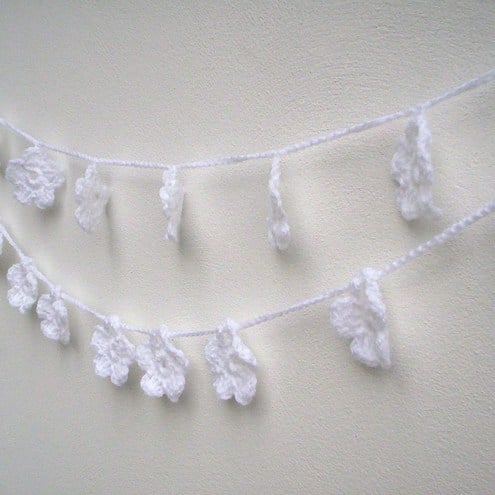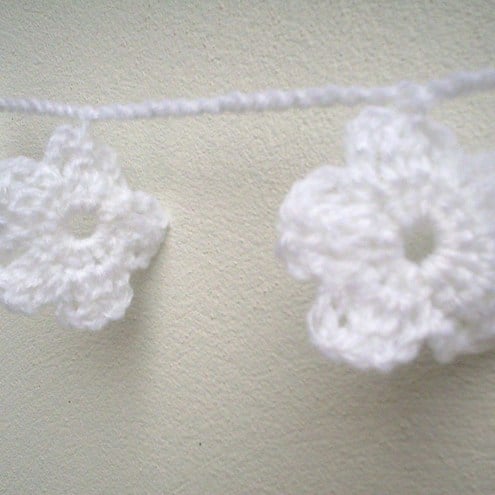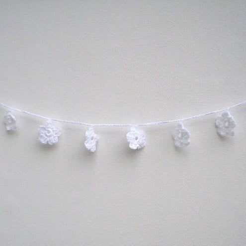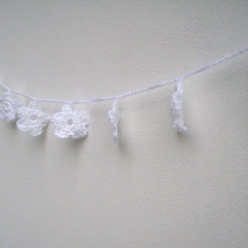 A white, crochet flower garland perfect for a wedding or Christening.