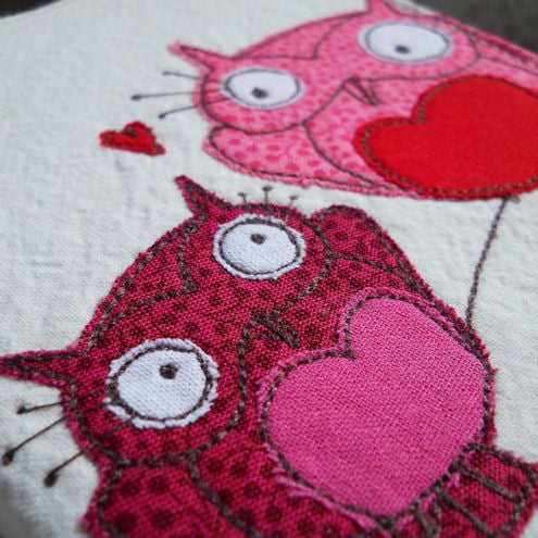 the owls are in pink floral-printed cotton fabrics which are appliqued onto pre-washed calico, before being "drawn" on with free machine embroidery.