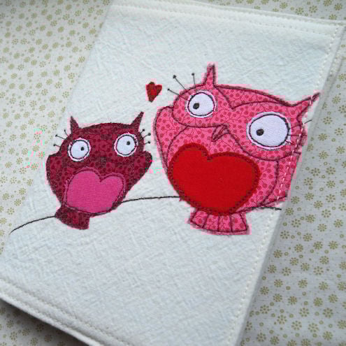 this notebook features a pair of appliqued and embroidered pink owls on the front cover.