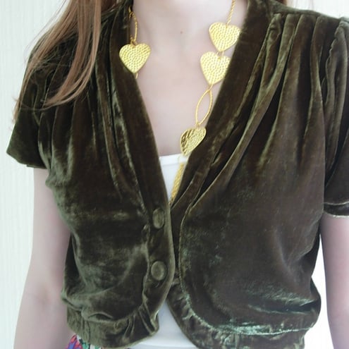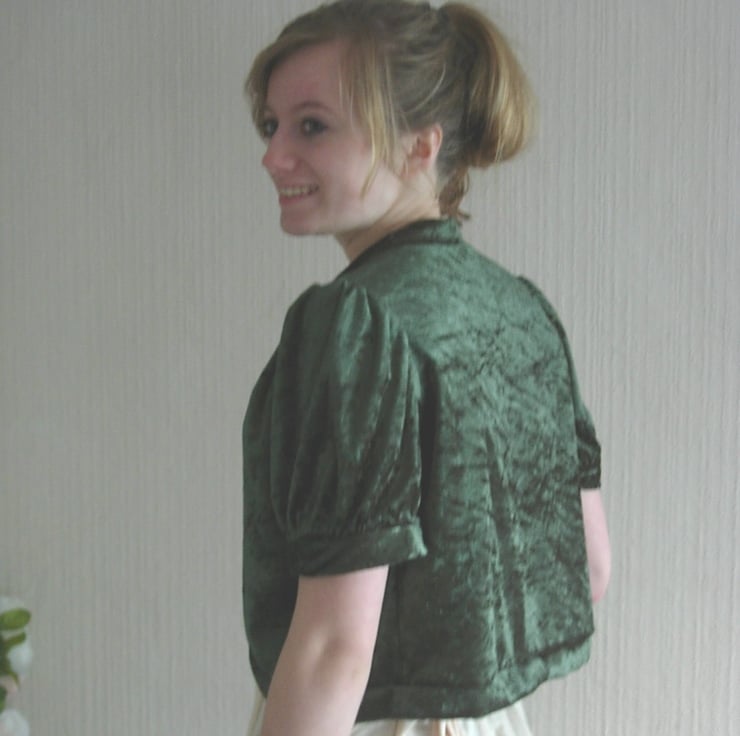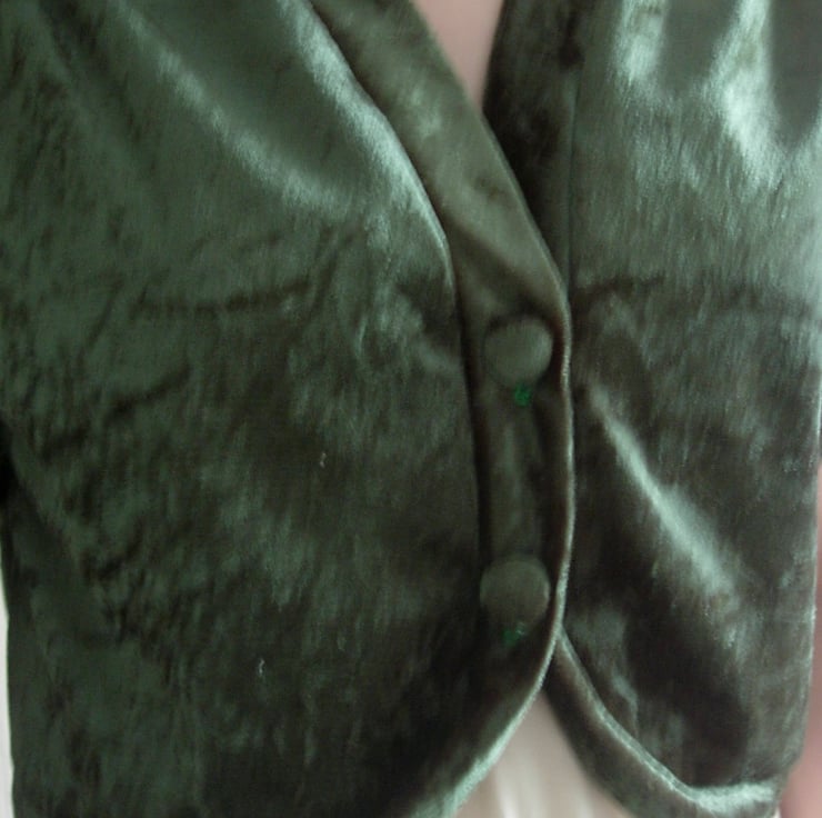 Charming little velvet shrug (bolero). This has short sleeves, pleated detail at the shoulder and a bolero style curved front edge. Custom made to your measurements and from a choice of colours shown. Simply provide your measurements and colour preference when ordering!