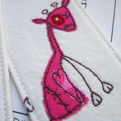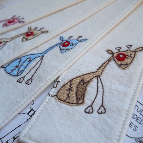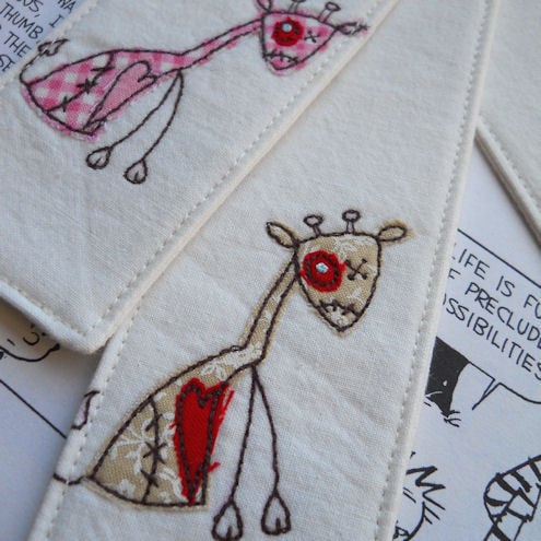 these cute zombie giraffes are in cotton fabrics which are appliqued onto calico, before being "drawn" on with free machine embroidery. they have one hand embroidered eye, and their mouths have been stitched shut so they cannot bite they’re available in a variety of colours – please let me know which you’d like when ordering: 1x pink gingham, 1x cream still available