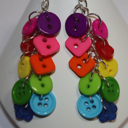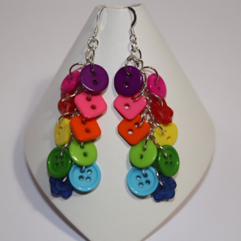 These striking button drop earrings are rich with an assortment of buttons of all the colours of the rainbow.