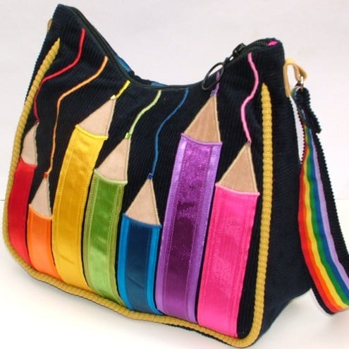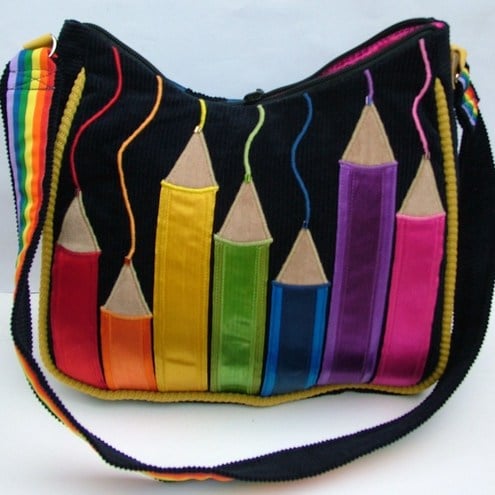 The front is made from navy corduroy layed with 7 different coloured ribbons (2 different size ribbons on each pencil) to produce a multi coloured pencil effect, each pencil has been hand beaded to give the pencil leads an extra sparkle.