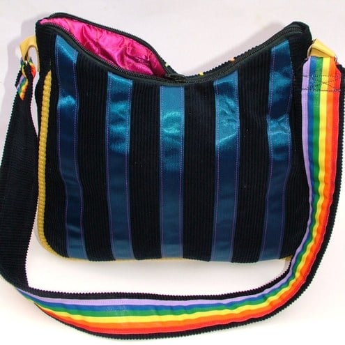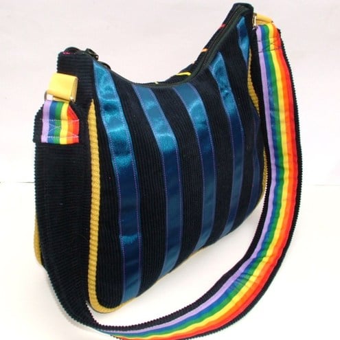 The long rainbow shoulder strap is attached to the bag with two yellow leather straps and 2 metal D rings